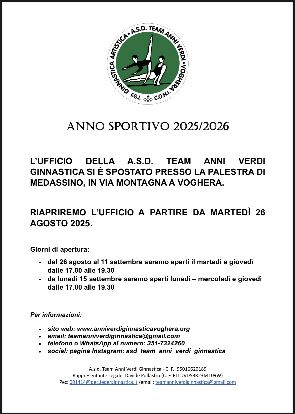 Vi ricordiamo che l'ufficio da quest'anno non è più in via Kennedy, 90 Voghera, ma presso la palestra di Via Montagna a Medassino (Voghera).